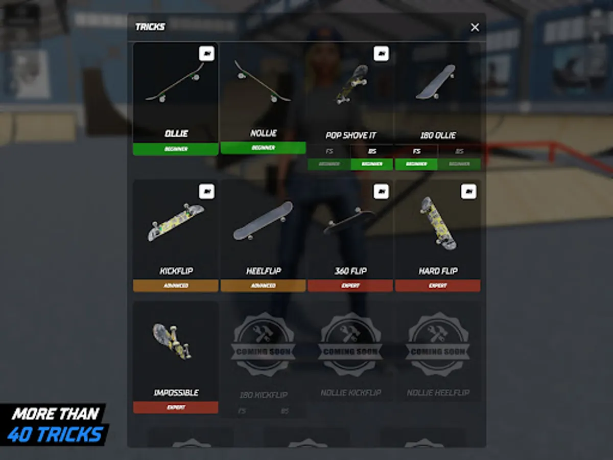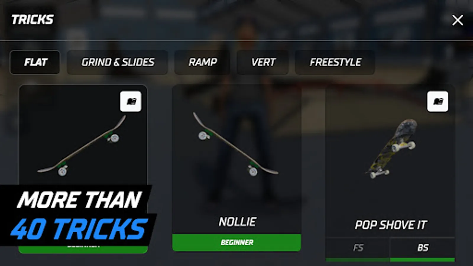 More than 45 tricks available in 5 categories : flat, grind/slides, ramp, vert and freestyle with weekly updates.