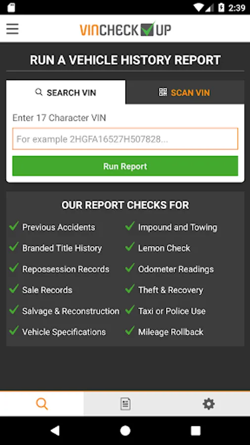VINCheckup is an information product that provides users with easy and inexpensive Vehicle History Reports. Our reports can provide users with detailed vehicle specifications along with vehicle Accident History, Salvage and Total Loss events and much more...