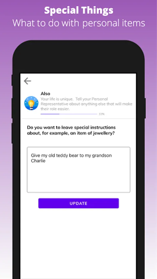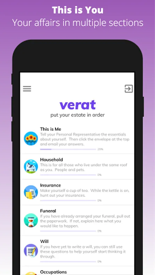 Verat leads you by the hand through the difficult issue of explaining clearly, to your executor or personal representative, your finances and assets. Verat can go alongside your will to help describe your estate. However, it does not need you to have a will in place for it to help. By completing Verat you may save your personal representative hours, and more likely days, of difficult paperwork at an emotionally challenging time. It can function as part of a 'letter of wishes' to help your administrator. Verat is straightforward to use and flexible enough to capture valuable information about your finances, housing, vehicles, funeral arrangements, those friends and family who may need to know about your funeral, heathcare providers, your internet accounts and much more; all the things that make up a real, complex life. All your personal data stays personal to you and whoever you choose to share it with. Verat makes it simple for you to share different aspects of your life quickly with the person you are asking to be your executor. Verat will not ever have access to, or store, your data. While completing Verat is your way of paying forward to your executor, it can help you gain a clear picture of your finances that could help you tidy up and rationalise your outgoings.