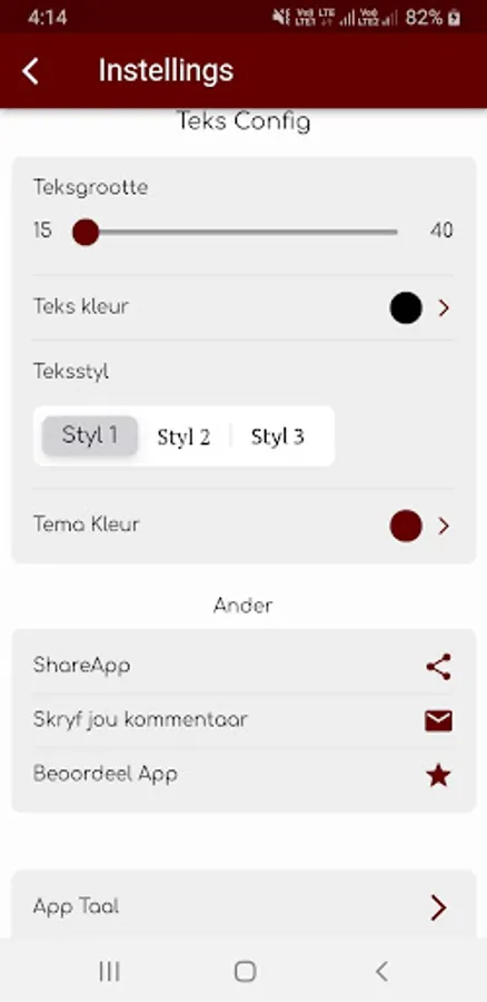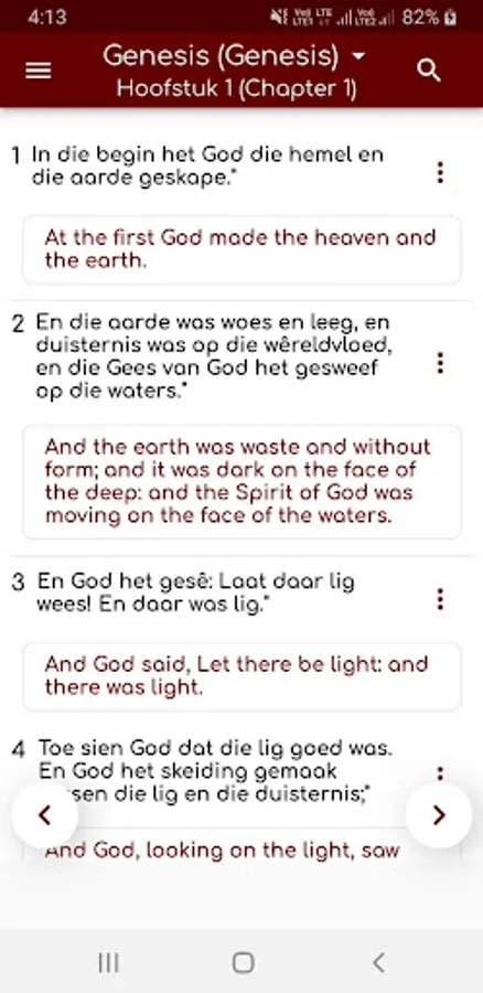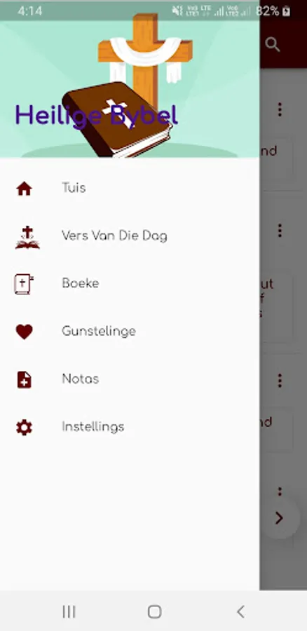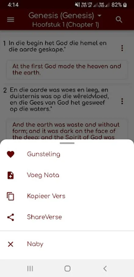 Die Bybel bied bedieningselemente vir fyner leeswerk, soos zoom en kleurkontras vir beter leeswerk (kyk in-app-instruksies)