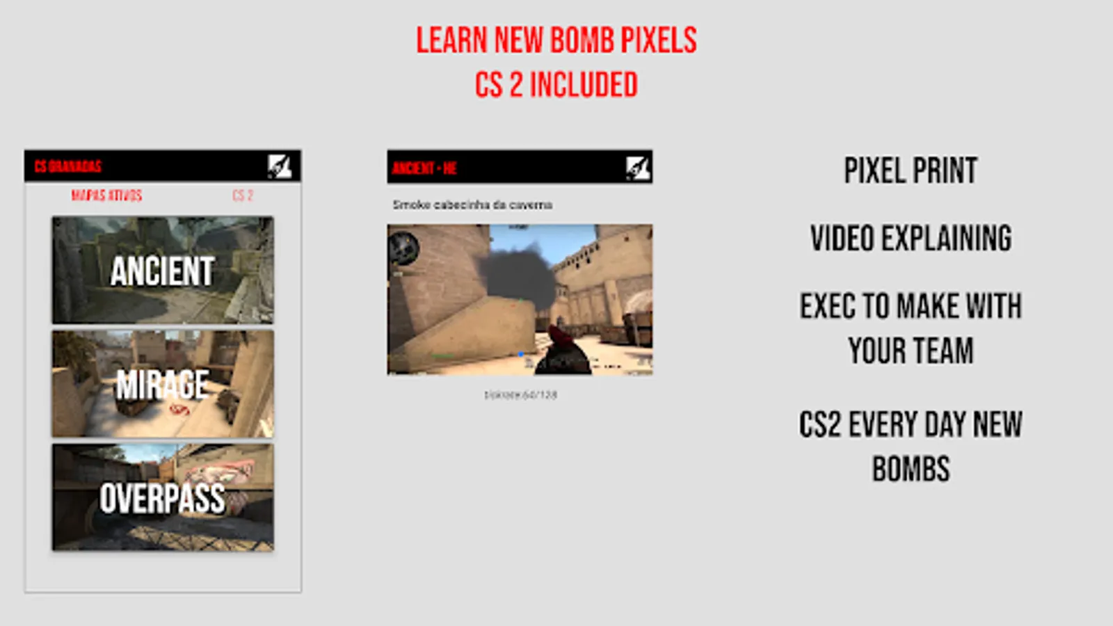 CS Grenades is an essential tool designed to help players of all skill levels master the art of throwing grenades with precision and strategy. With intuitive features and a user-friendly interface, this app offers a complete and enhanced experience for your enhanced game play.