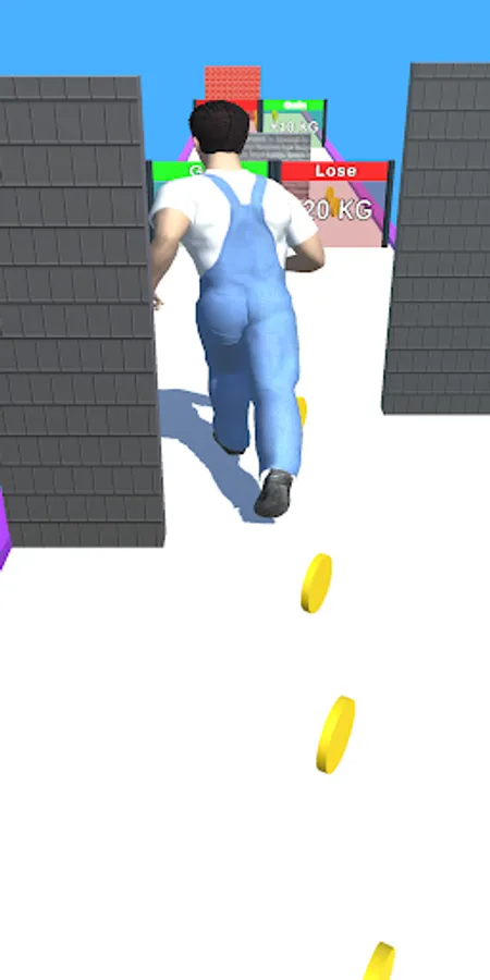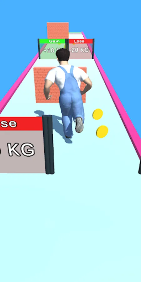 Player can run and collect dumbells and coins. When the player move with gain or lose gates, he will gain some weight and lose some weight. When he gain weight, he becomes bigger and gets some power to break the blocks.