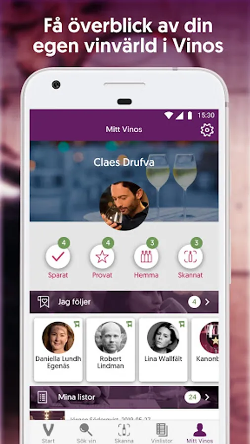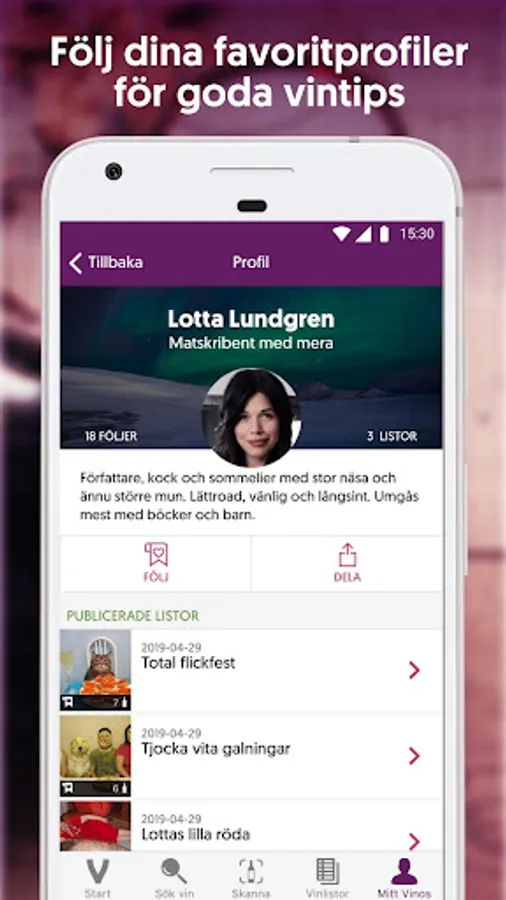 In the app you will find a growing number of Swedish profiles - everything from pure wine tasters, such as Alf Tumble and Daniella Lundh Egenäs, to wine-interested celebrities, such as the artist Petter and the TV profile Lotta Lundgren. The profiles help you with concrete wine tips.