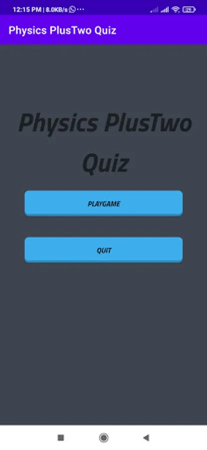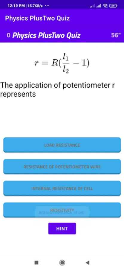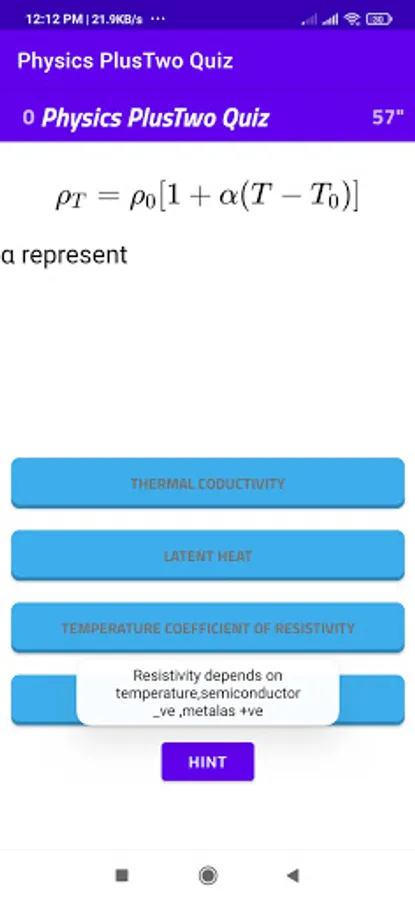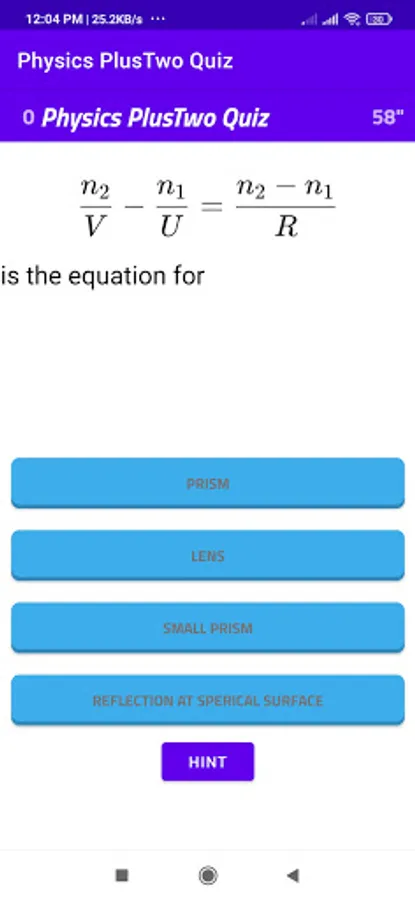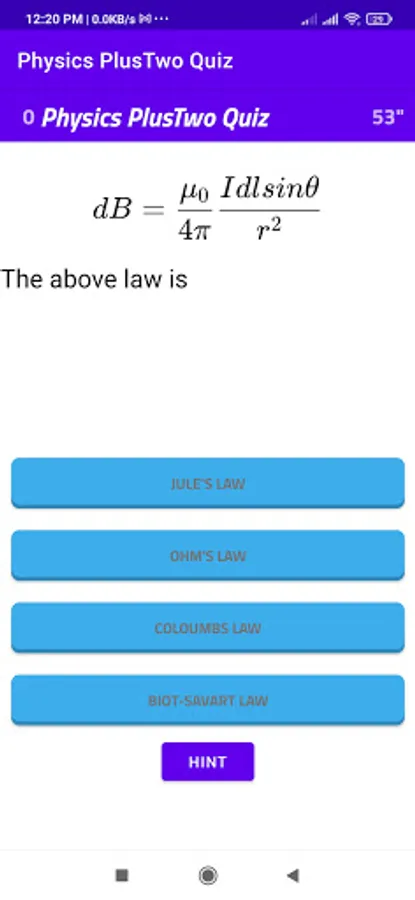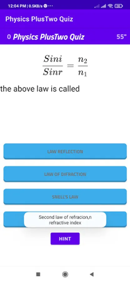 This is a basic physics multiple choice question app for self learning. The questions mainly focus on Plus Two(10+2/CBSC/NCERT) students. The questions consist of equations , small problems related to physics. The students can press the correct answer then another window appears to go to next questions. If it is wrong the game fails and play again window appears. Hint button provide for help to find answer.There are 60 second for one answer if he cannot complete in 60 seconds time up window opens and there is an option to play again. The app is designed to answer question in given time. If there is any mistake in any question please remind me to correct it. Study well.