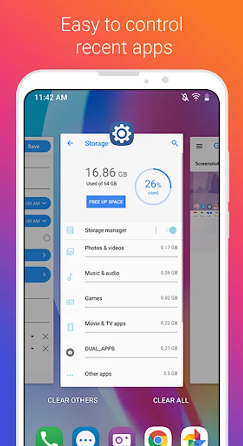 • Close many apps or all apps (excluding the one in-use) simultaneously with only a single touch.