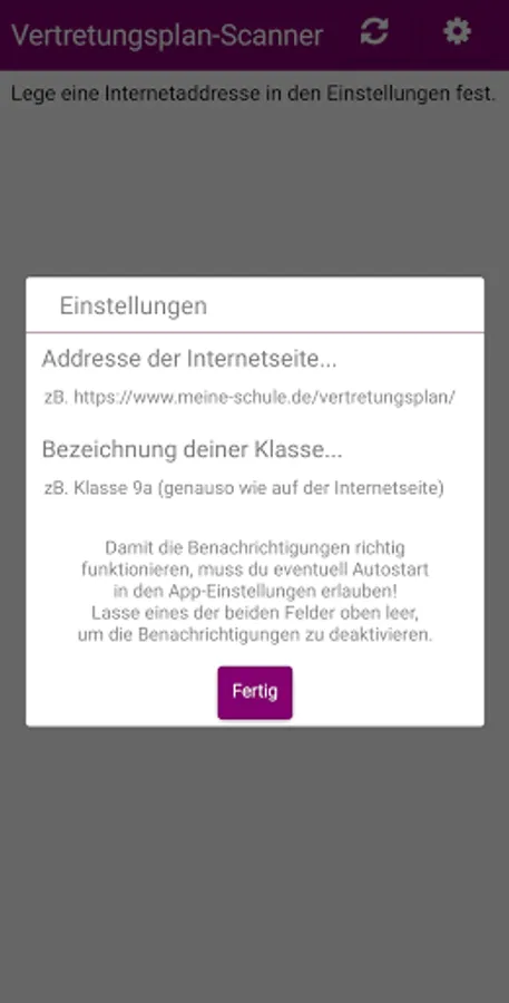 Simply enter your class and the address (URL) of the website of your school where the substitution plan will be published. The app then regularly downloads the source text of the page in the background and searches it for your class. If it is found, you will receive a notification with which you can call up the substitution plan within the app with one click.
