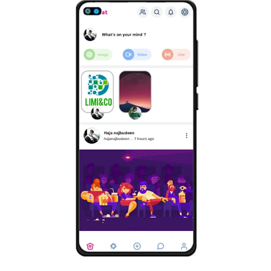 * User can follow profiles, watch party (watch movies, videos & song while chatting with friends), create meetings (video conference), face filter camera, video & image editor, poke users, private chat, create groups, group chat, marketplace, sell products, live stream, podcast, stories, night mode and much more.