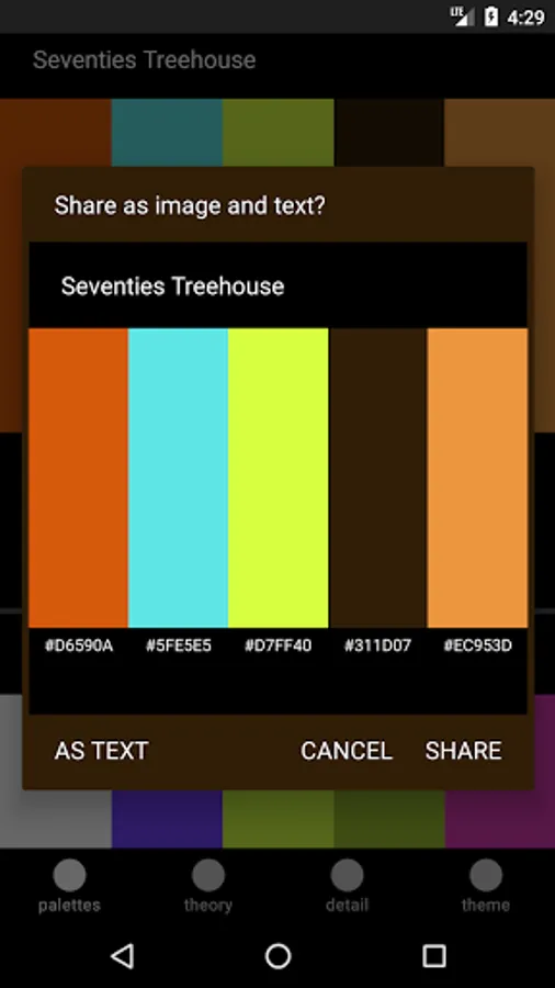Use QuickPalette's Palettes tab to share png photos of your palettes including text hex and rgb codes for easy copy/paste.