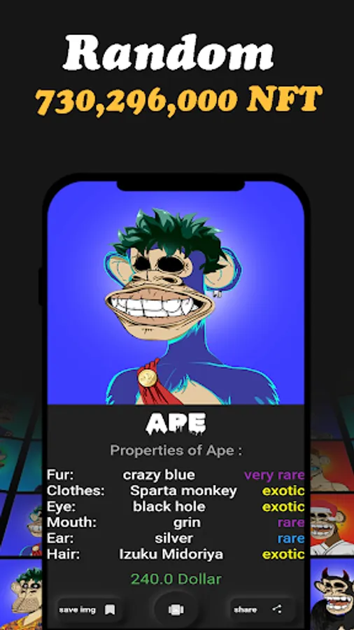 easy to create NFT with us , create NFT image you can own it or sell it as you like ,create insane ape ,u have more than 730 million random NFT , and we didn't use any of this NFT in any where .