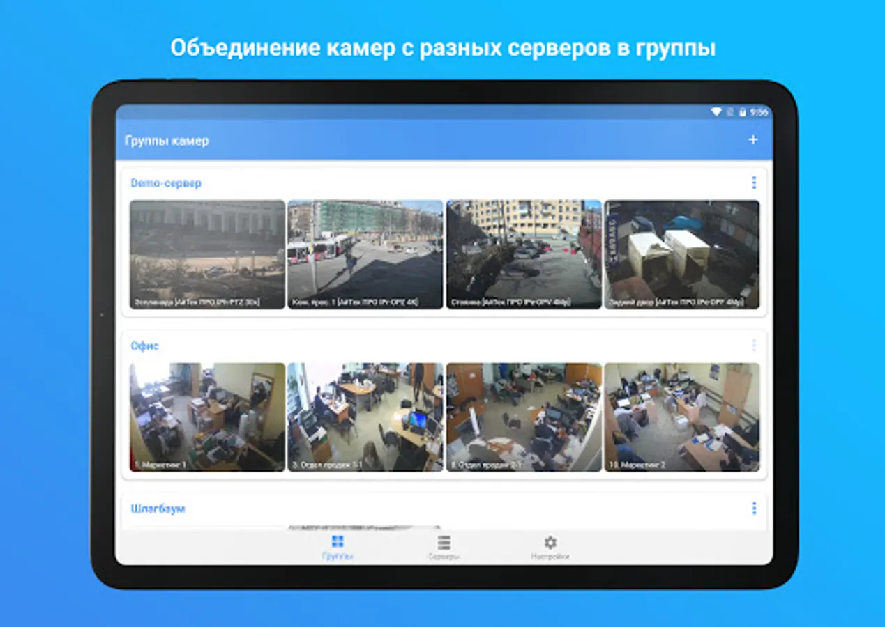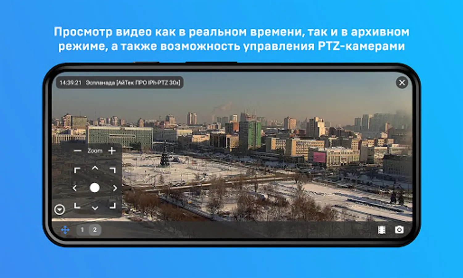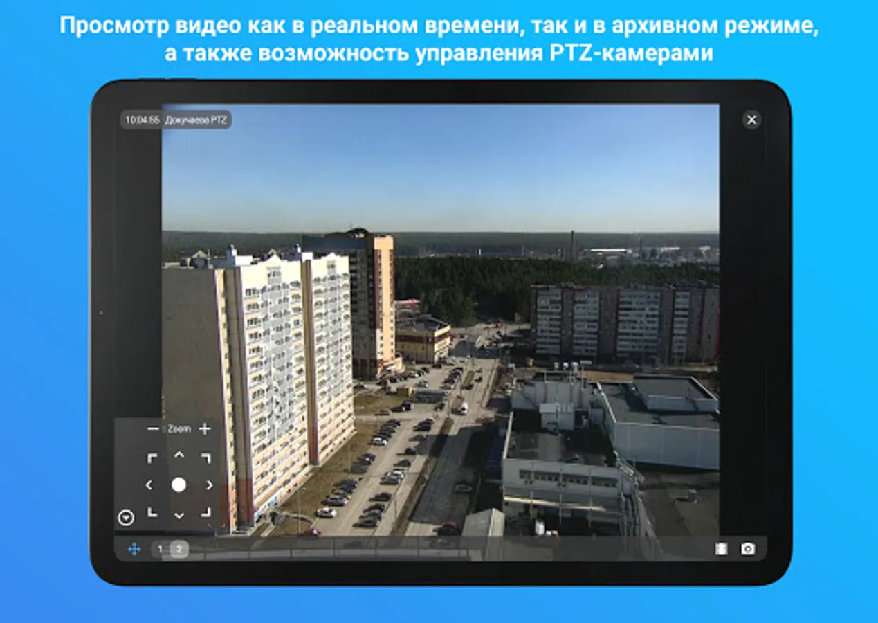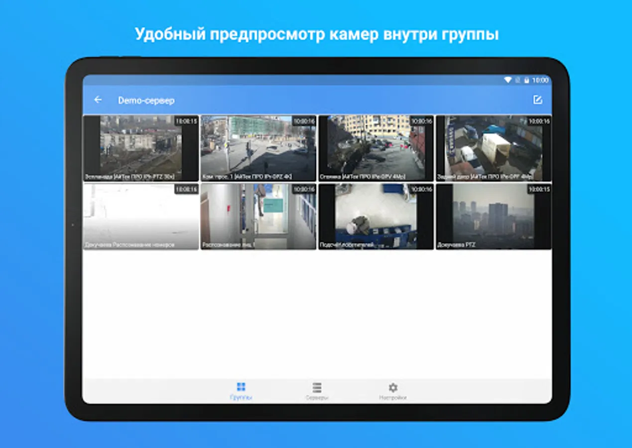 The intuitive interface of the application allows you to create groups of cameras, quickly switch between cameras and groups; watch video, both in real time and in archive mode; control PTZ cameras; listen to the sound.