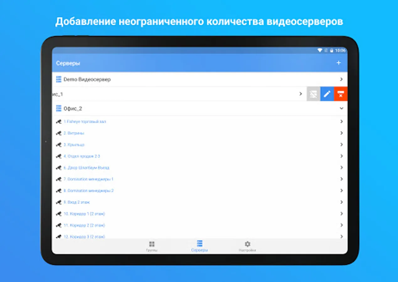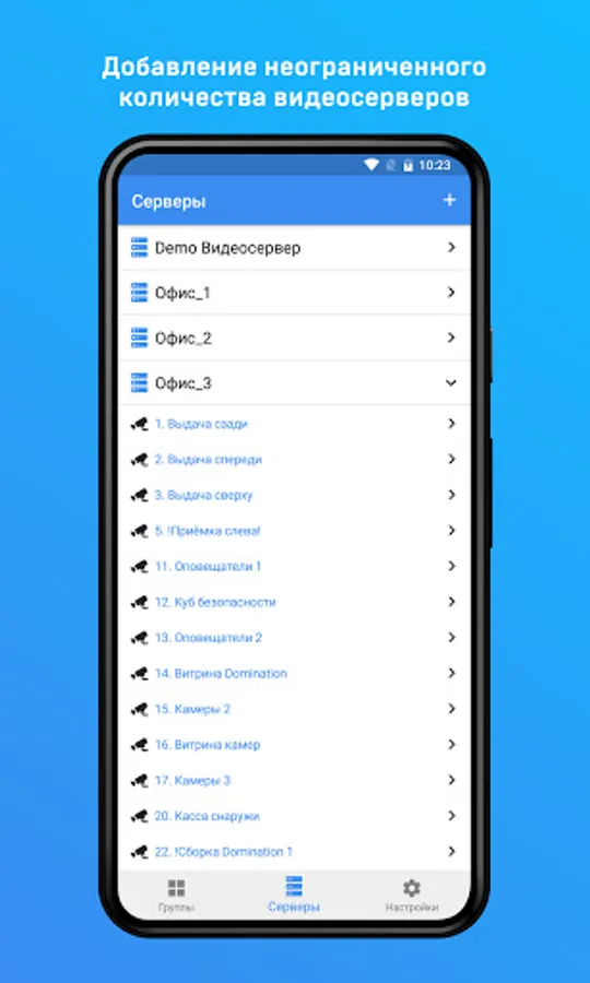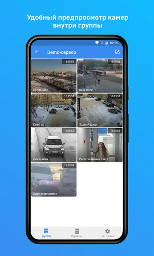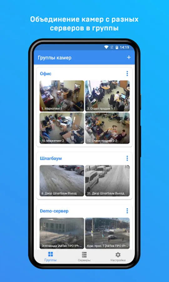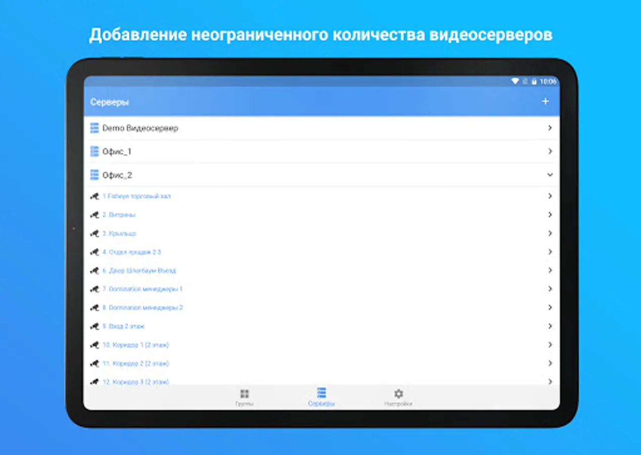 The intuitive interface of the application allows you to create groups of cameras, quickly switch between cameras and groups; watch video, both in real time and in archive mode; control PTZ cameras; listen to the sound.
