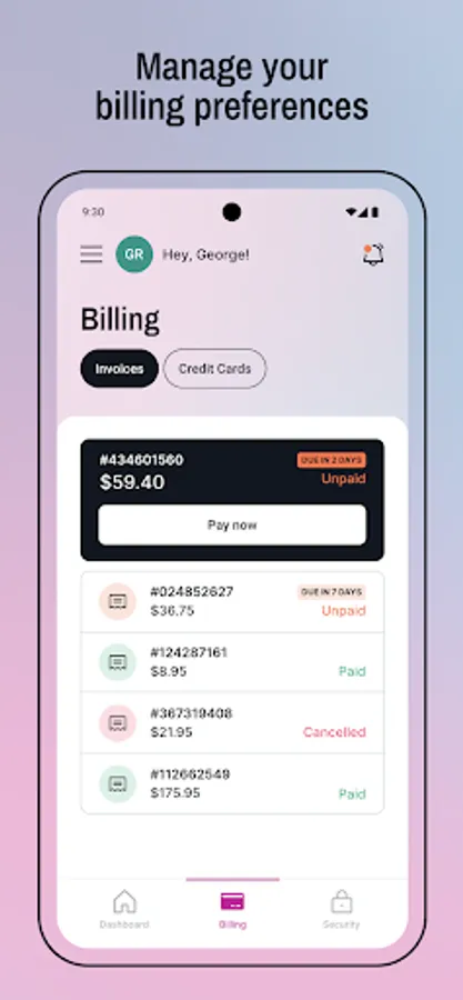 - Manage, view and pay your account invoices through the app's dedicated billing section.