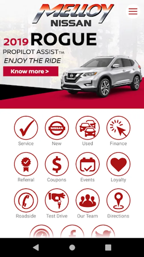 Melloy Nissan loyalty app provides customers and shoppers with an enhanced dealership mobile experience. The mobile car dealership app uses background geo-location for geo-fencing and geo-targeted push notifications to provide customers with relevant specials and loyalty offers. The app also delivers a wide range of features/benefits to customers, including loyalty rewards, mobile coupons, mobile events, and a digital referral program.