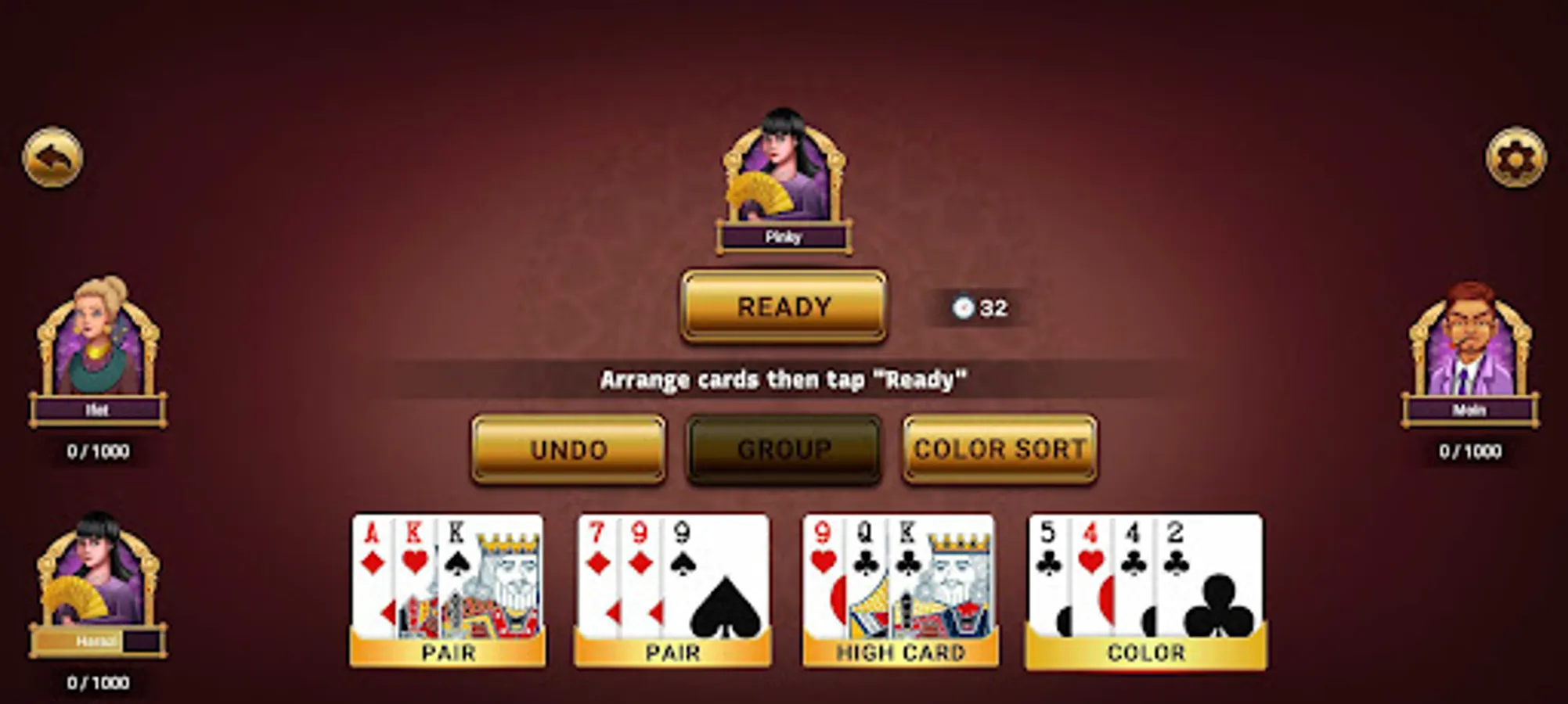 The dealer deals out all the cards to the players so that each player has a hand of 13 cards. Each of the players then divides their cards into four separate groups of 3, 3, 3, and 4 cards.