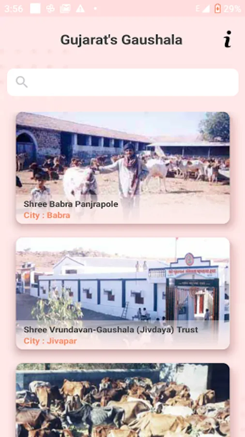 Gaushalas or Goshalas are protective shelters for cows in India. Goshala, a Sanskrit word "Go" means cow and "Shala" means a shelter place: Go + Shala = shelter for cows, means the abode or sanctuary for cows.The Panjarapoles most earnestly request and expect generous donations and help from philanthropic persons, organisations and institutes to support its aims to render services and shelter to unfortunate animals. Gujarat's Gaushala & Panjarapol app has all information of gujarat's gaushala.The app stores the address of all gaushala, their trustee name. So we can easily find out any gaushala of Gujarat. It also stores the how many cows are they have.It also show the email address and contact numbers of gaushala. So, we can easily contact them.It also show the bank details of gaushala like branch name, bank name, A.C. no. So, if we want to donate the money it is very helpful for us. Thus , Gaushala & Panjarapol app has total information of gujarat's gaushala.