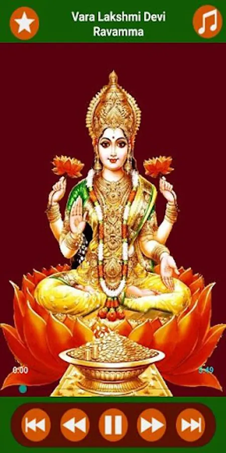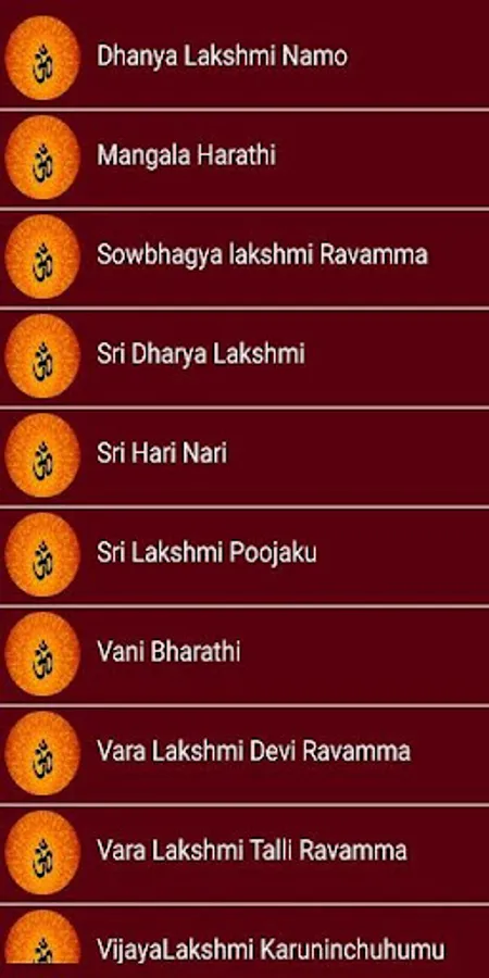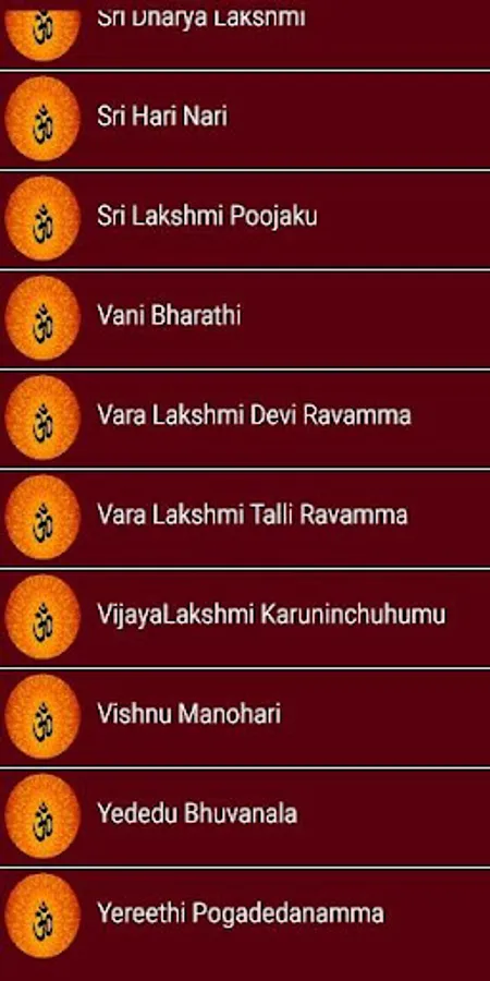 Dhanya Lakshmi Namo,Mangala Harathi,Sowbhagya lakshmi Ravamma,Sri Dharya Lakshmi,Sri Hari Nari,Sri Lakshmi Poojaku,Vani Bharathi,Vara Lakshmi Devi Ravamma,Vara Lakshmi Talli Ravamma,VijayaLakshmi Karuninchuhumu,Vishnu Manohari,Yededu Bhuvanala,Yereethi Pogadedanamma these are the songs that are available in this application
