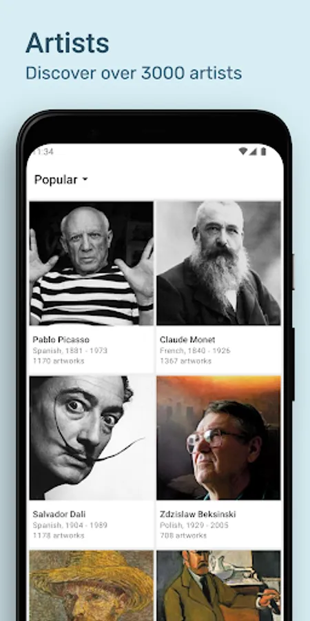 Pablo Picasso, Claude Monet, Salvador Dali, Van Gogh, Zdzislaw Beksinski, Henri Matisse, Cezanne, Wassily Kandinsky, Rene Magritte, Edward Hopper, Pierre-Auguste Renoir, Paul Gauguin, Jean-Michel Basquiat, Gustave Dore, Paul Klee, Rembrandt, Frida Kahlo, Egon Schiele, John Singer Sargent, Edgar Degas, Leonardo da Vinci, Gustav Klimt, Joan Miro.