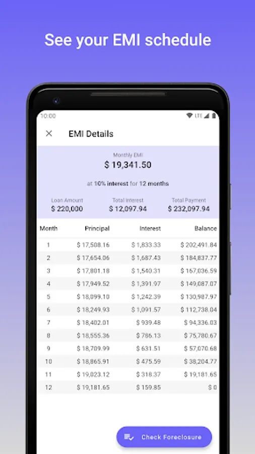 • Detailed EMI calculation for your loan just by inputting all the required values: