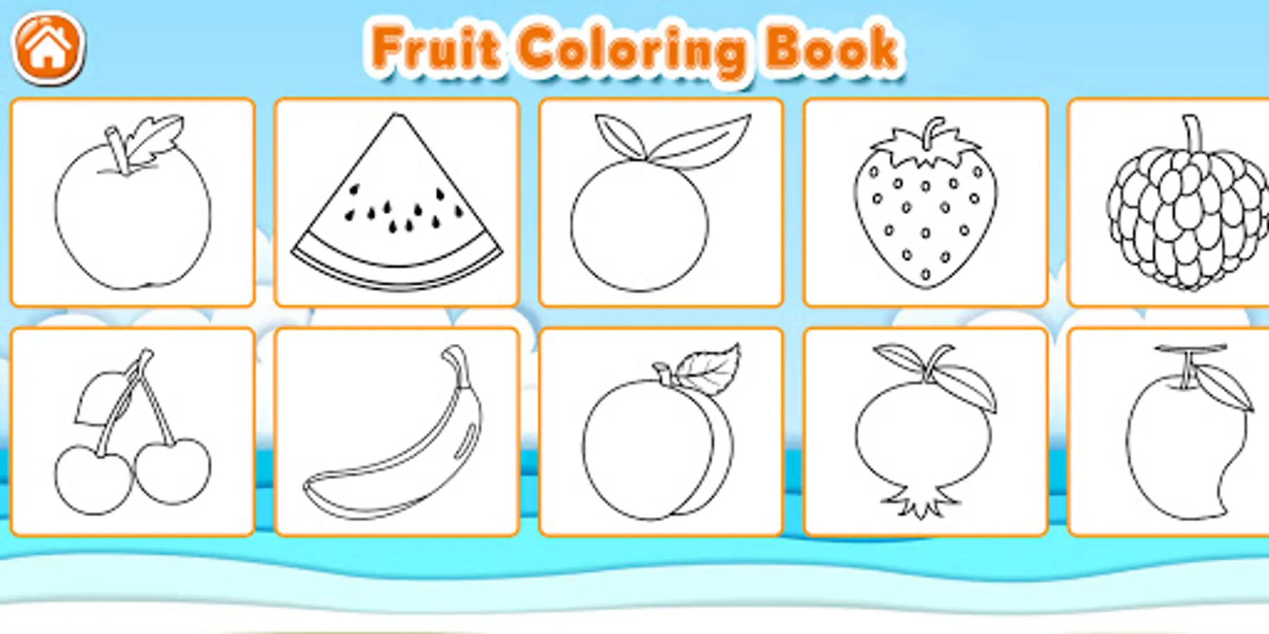- Many Beautiful drawings of apples, banana, mango, grape, watermelons, orange, cherry, berries, kiwi, star fruit, papaya, lichi, coconut, pomegranate and pineapples to Color.