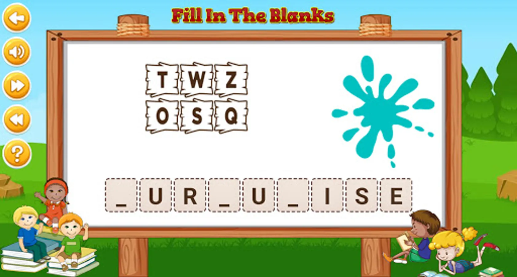 Fill In The Blanks: Kids spell out the name of the picture using letters on the screen. There is blank between letters of spelling and related letters are there to fill blanks.