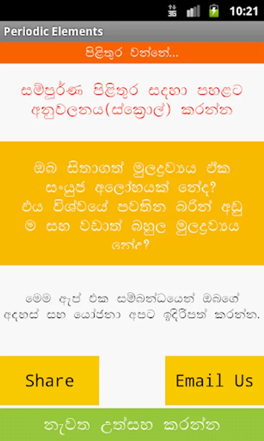 ‘Periodic Elements’ is the first ever known Mobile App designed for Science Students in Sinhala to make Sri Lankan science students learn the basics of chemistry in a novel and more exciting manner. This app is based on a card game created by Mr A.P Weerasooriya which is specifically created for science students,not only makes it easy for the students to memorize the properties of the chemical elements that are included in their syllabuses, but also gives them the opportunity to learn chemistry as a new & unique adventure.