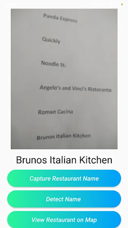The main objective of this task at hand is to develop an android system that could recognize the text (here in context of the restaurant names) with the help of the ML kit along with the restaurants location with help of Google Places API. This restaurant text detection will in turn help us for obtaining suggestion with similar cuisine type restaurants within a certain predefined radius. (Restricted for CSUF only)
