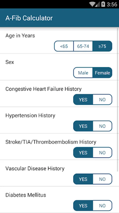 Use A-Fib Calc to calculate the CHA2DS2-VASc score and determine stroke risk in A-Fib by inputting the appropriate responses to the following criteria: