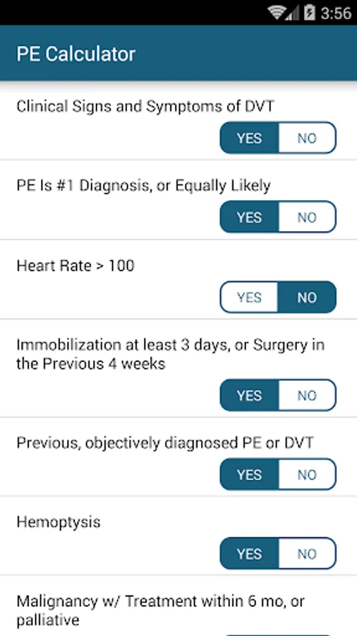 To use PE Calc, enter a yes or no response to each of the criteria:
