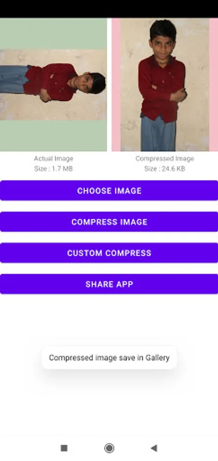 Compress JPEG images and photos for displaying on web pages, sharing on social networks or sending by email. This app will allow you to compress large photos into smaller sized photos with very less or negligible loss in quality of the image. Now you do not require any desktop or laptop computers with special software for image compression. Apart from compressing photos this app can also resize photos for you.