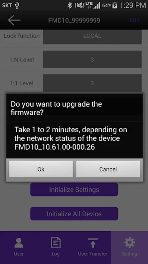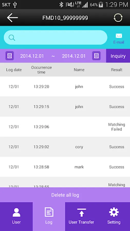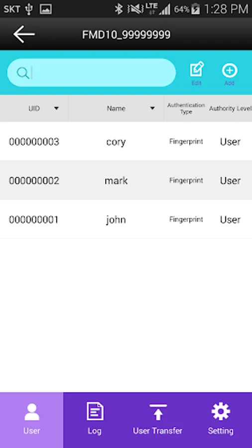 Transfer of user data saved on a smartphone to another FMD-10 device or retrieve user data from i-UNIS (wireless access control service application for AC-F100 users).
