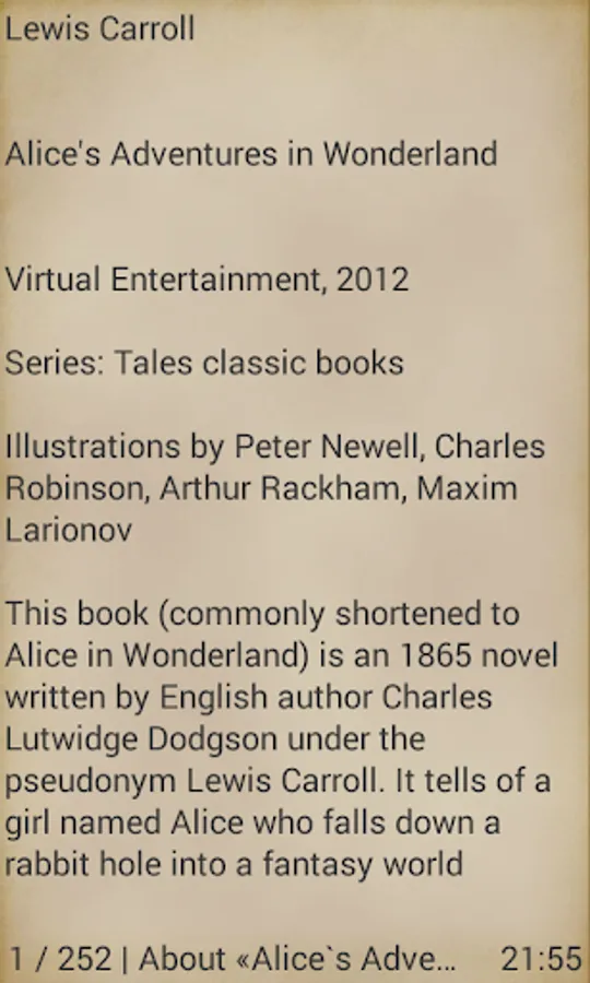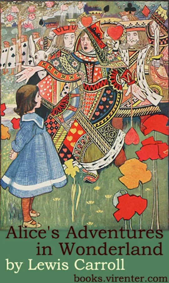 This book (commonly shortened to Alice in Wonderland) is an 1865 novel written by English author Charles Lutwidge Dodgson under the pseudonym Lewis Carroll. It tells of a girl named Alice who falls down a rabbit hole into a fantasy world (Wonderland) populated by peculiar creatures. The tale plays with logic, giving the story lasting popularity with adults as well as children.