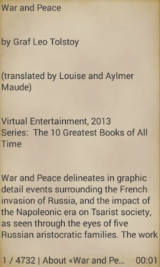 War and Peace delineates in graphic detail events surrounding the French invasion of Russia, and the impact of the Napoleonic era on Tsarist society, as seen through the eyes of five Russian aristocratic families. The work is epic in scale and is regarded as one of the most important works of world literature.