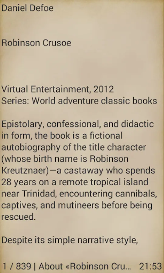 Epistolary, confessional, and didactic in form, the book is a fictional autobiography of the title character (whose birth name is Robinson Kreutznaer)—a castaway who spends 28 years on a remote tropical island near Trinidad, encountering cannibals, captives, and mutineers before being rescued.