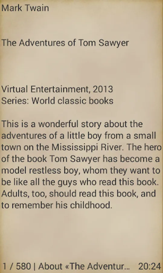 This is a wonderful story about the adventures of a little boy from a small town on the Mississippi River. The hero of the book Tom Sawyer has become a model restless boy, whom they want to be like all the guys who read this book. Adults, too, should read this book, and to remember his childhood.