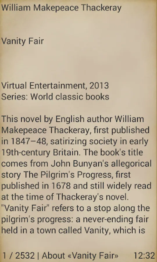 This novel by English author William Makepeace Thackeray, first published in 1847–48, satirizing society in early 19th-century Britain. The book's title comes from John Bunyan's allegorical story The Pilgrim's Progress, first published in 1678 and still widely read at the time of Thackeray's novel. "Vanity Fair" refers to a stop along the pilgrim's progress: a never-ending fair held in a town called Vanity, which is meant to represent man's sinful attachment to worldly things.