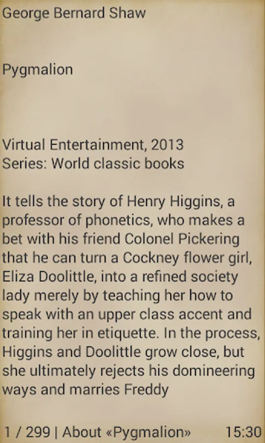 Cover and icon are drawing of Eliza Doolittle, a character from George Bernard Shaw's play Pygmalion, by George Luks (1867-1933)