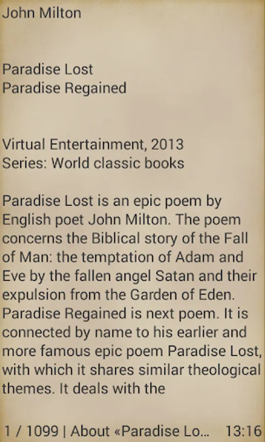 Paradise Lost is an epic poem by English poet John Milton. The poem concerns the Biblical story of the Fall of Man: the temptation of Adam and Eve by the fallen angel Satan and their expulsion from the Garden of Eden.
