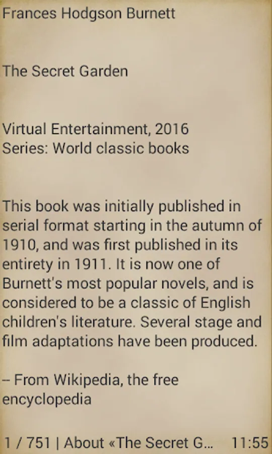 This book was initially published in serial format starting in the autumn of 1910, and was first published in its entirety in 1911. It is now one of Burnett's most popular novels, and is considered to be a classic of English children's literature. Several stage and film adaptations have been produced.