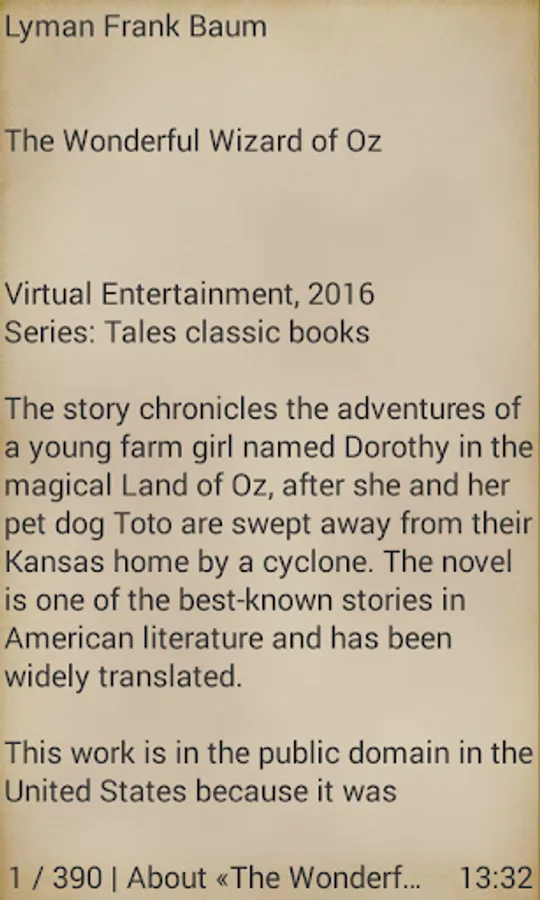 The story chronicles the adventures of a young farm girl named Dorothy in the magical Land of Oz, after she and her pet dog Toto are swept away from their Kansas home by a cyclone. The novel is one of the best-known stories in American literature and has been widely translated.