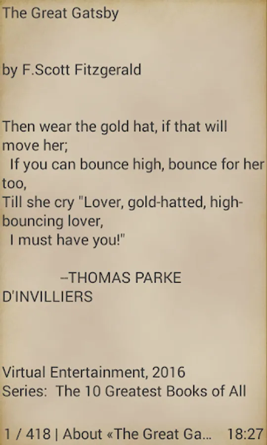 The story takes place in 1922, during the Roaring Twenties, the post-World War I prosperous time in the United States. Described as the "ironic tale of life on Long Island at a time when gin was the national drink and sex the national obsession," it received critical acclaim. In it Mr. Fitzgerald was at his best...his "ability to catch the flavor of a period, the fragrance of a night, a snatch of old song". The book is widely regarded as a "Great American Novel" and a literary classic, capturing the essence of an era and the post-war "carefree madness" of a nation hungry for life. The Modern Library named it the second best English language novel of the 20th Century.