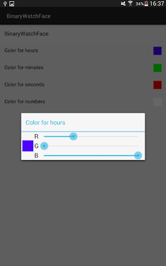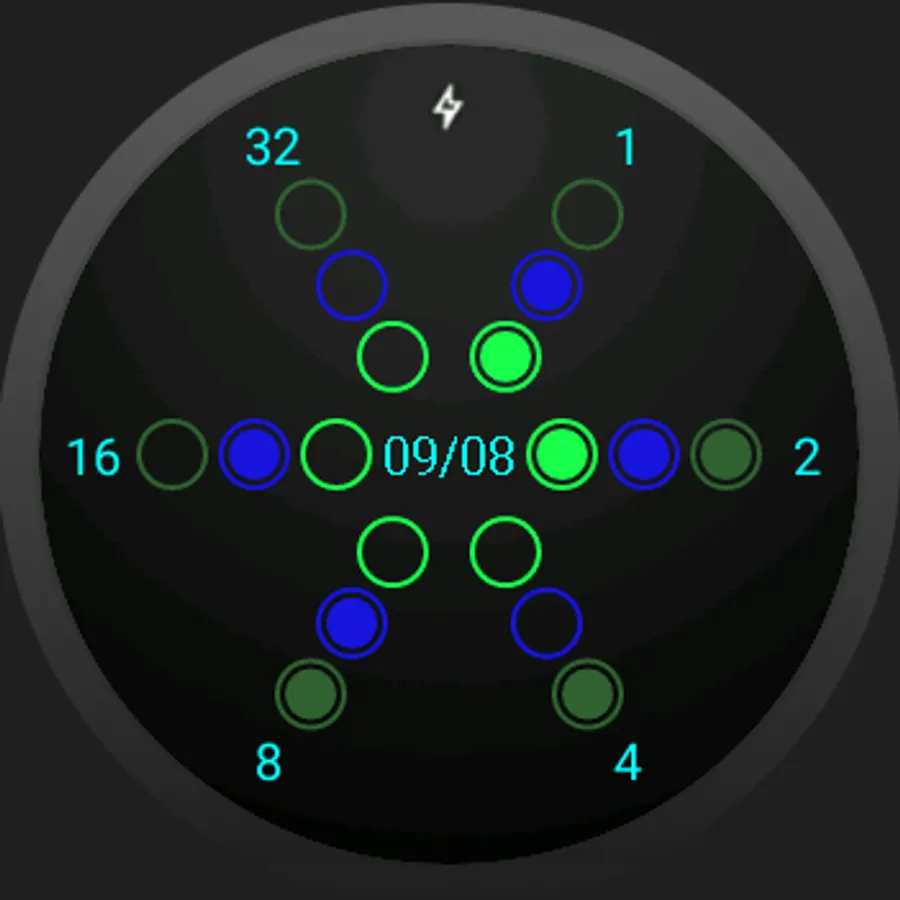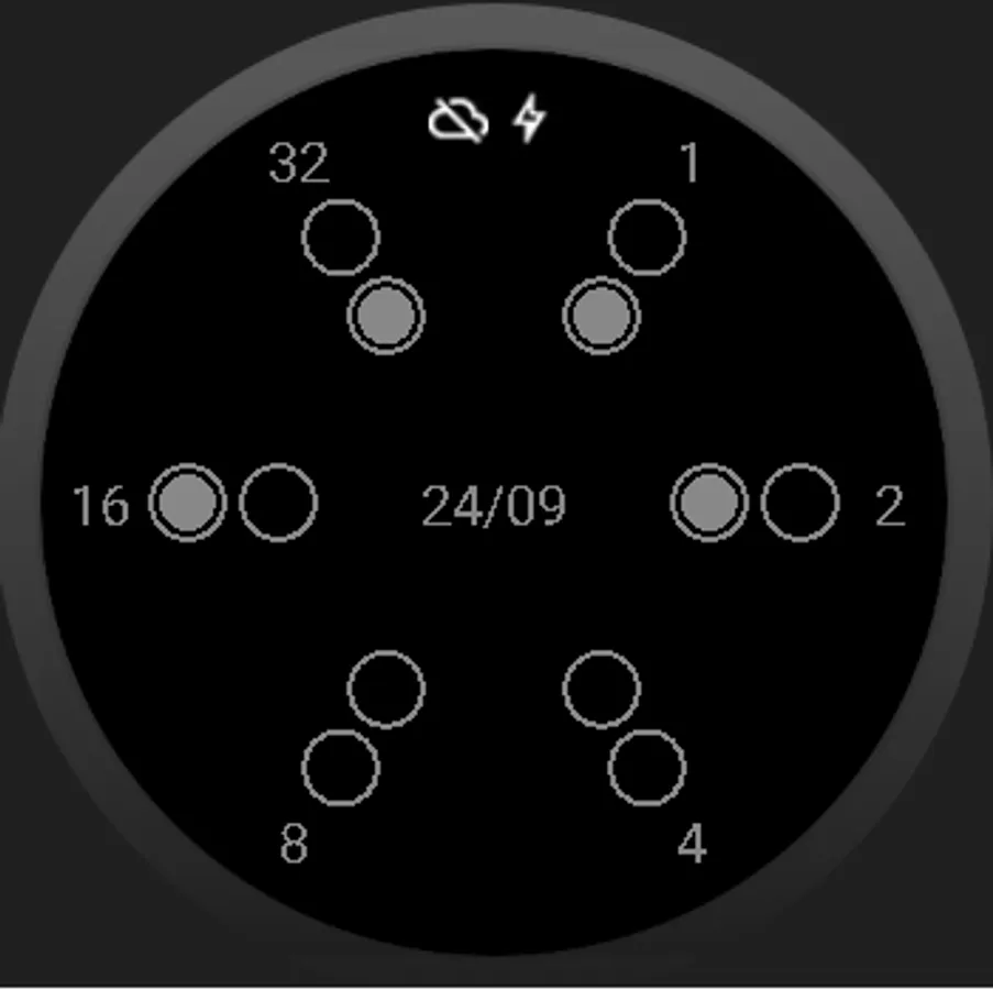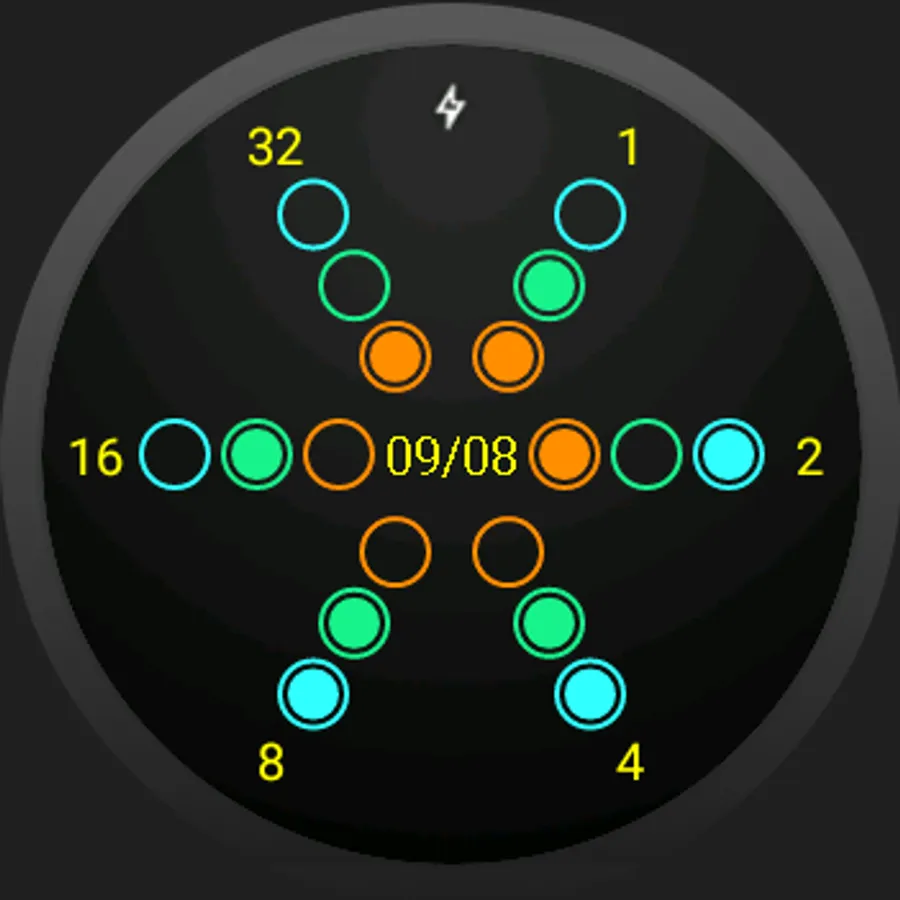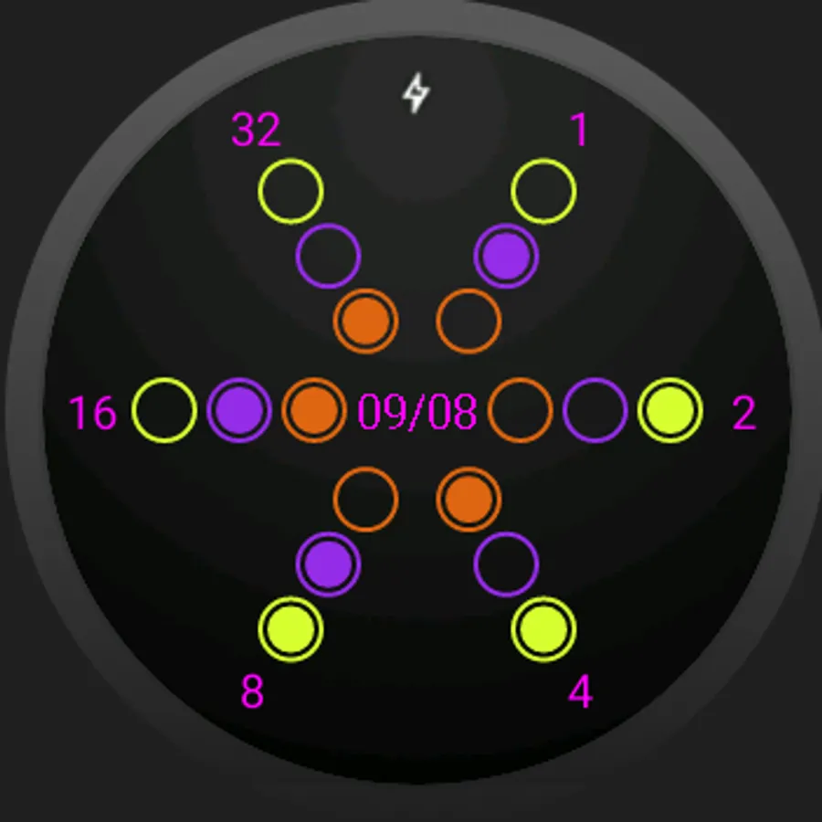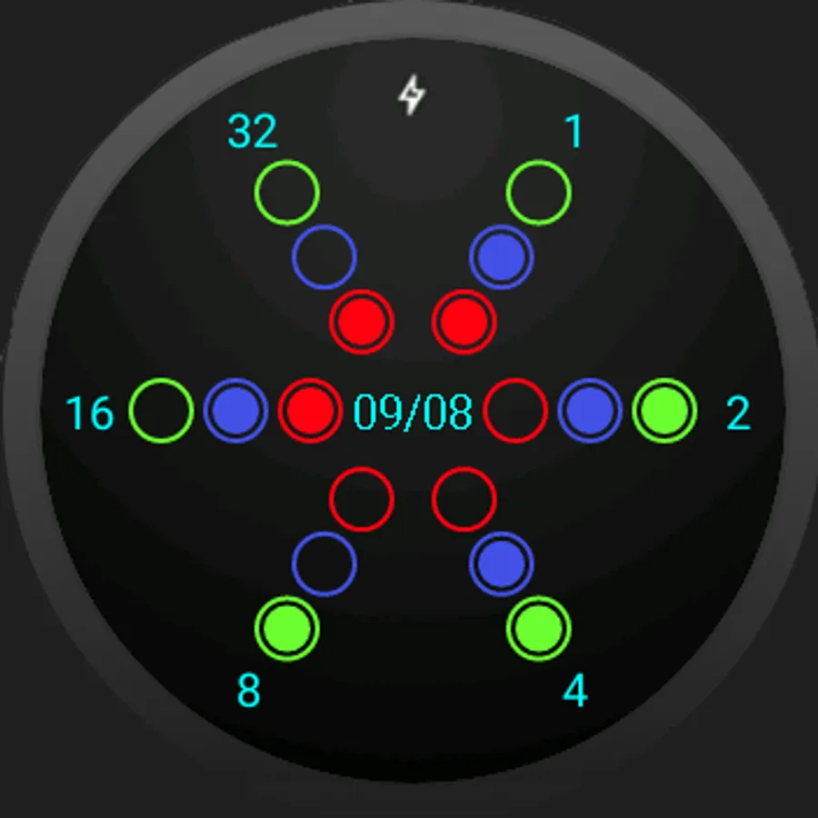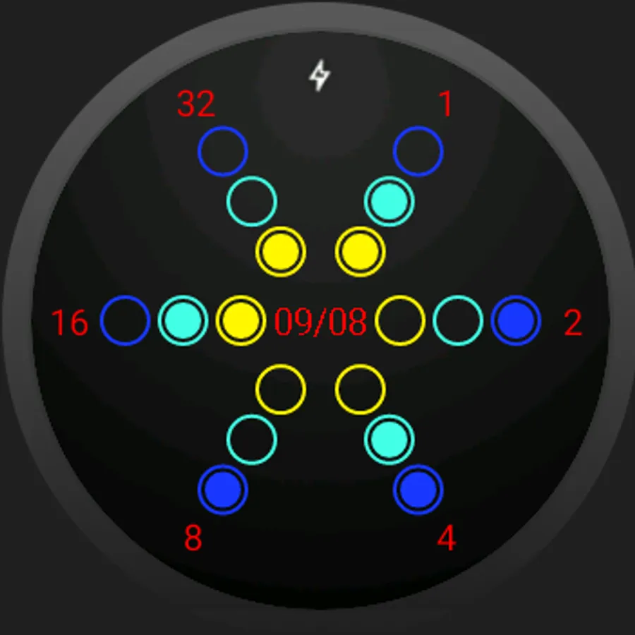 To read the hours, for example if the circle 16,4,2 is colore, the hours is 22 (16+4+2)