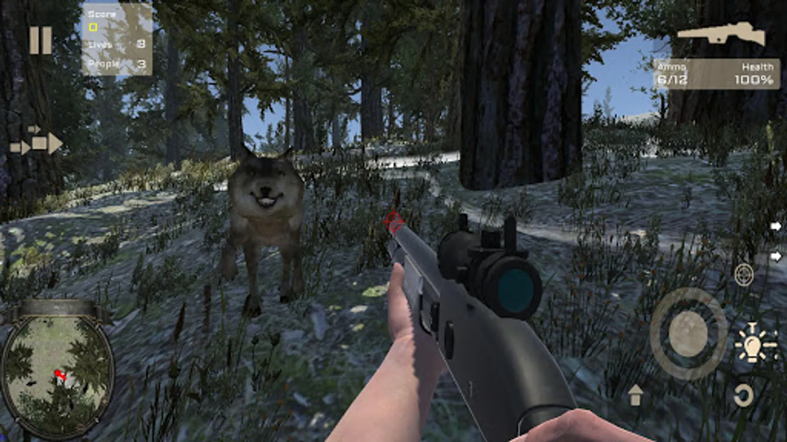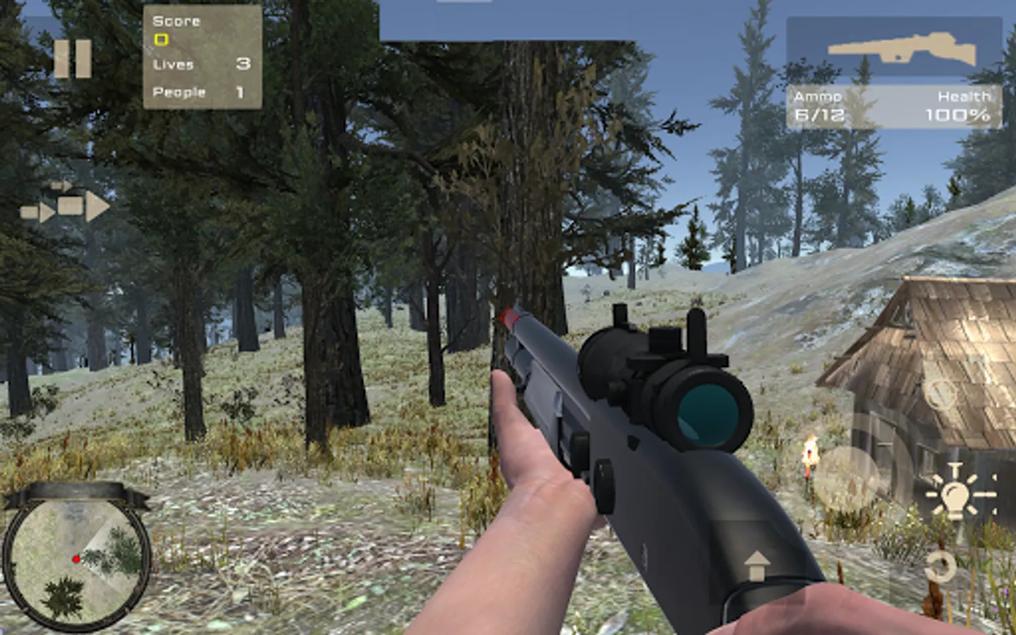Game for protect people from animals in a forest hunting patrol from one wooden cabin to another.