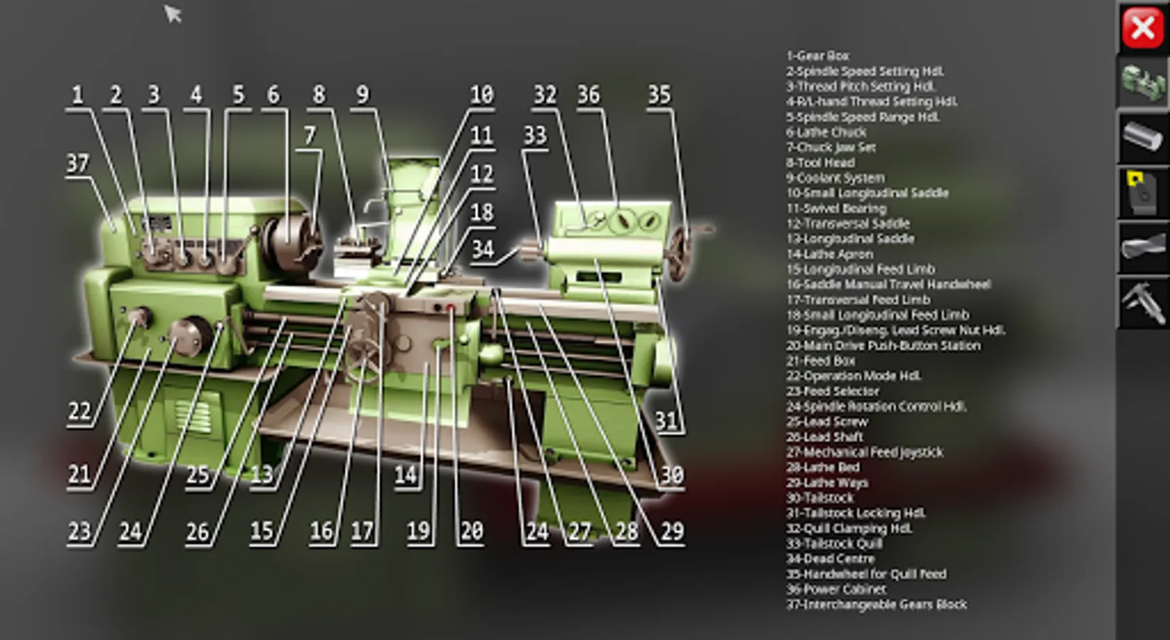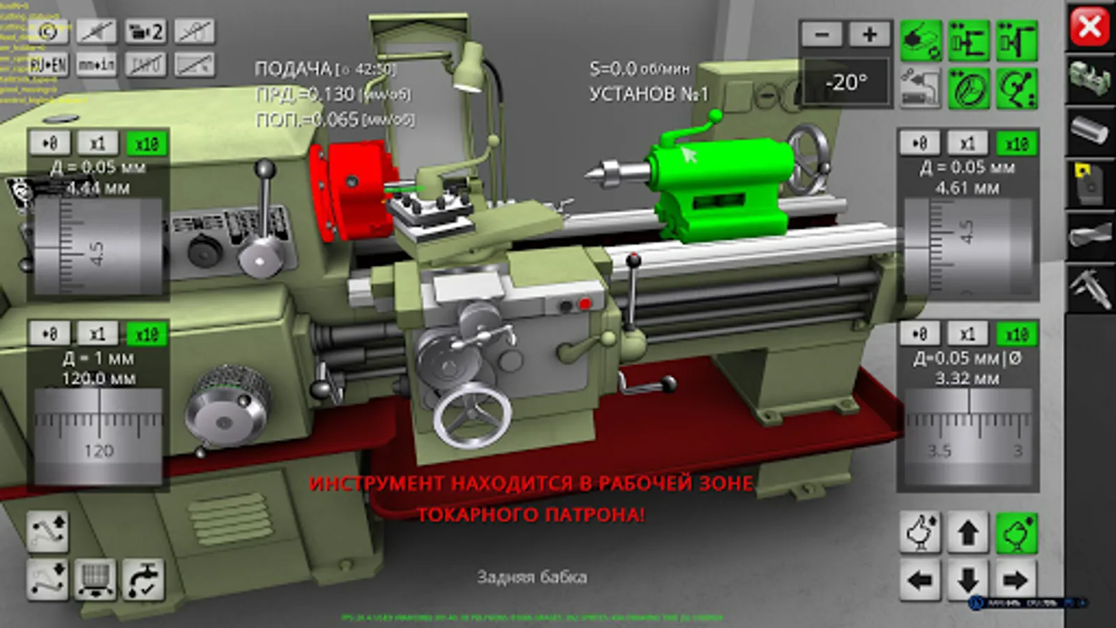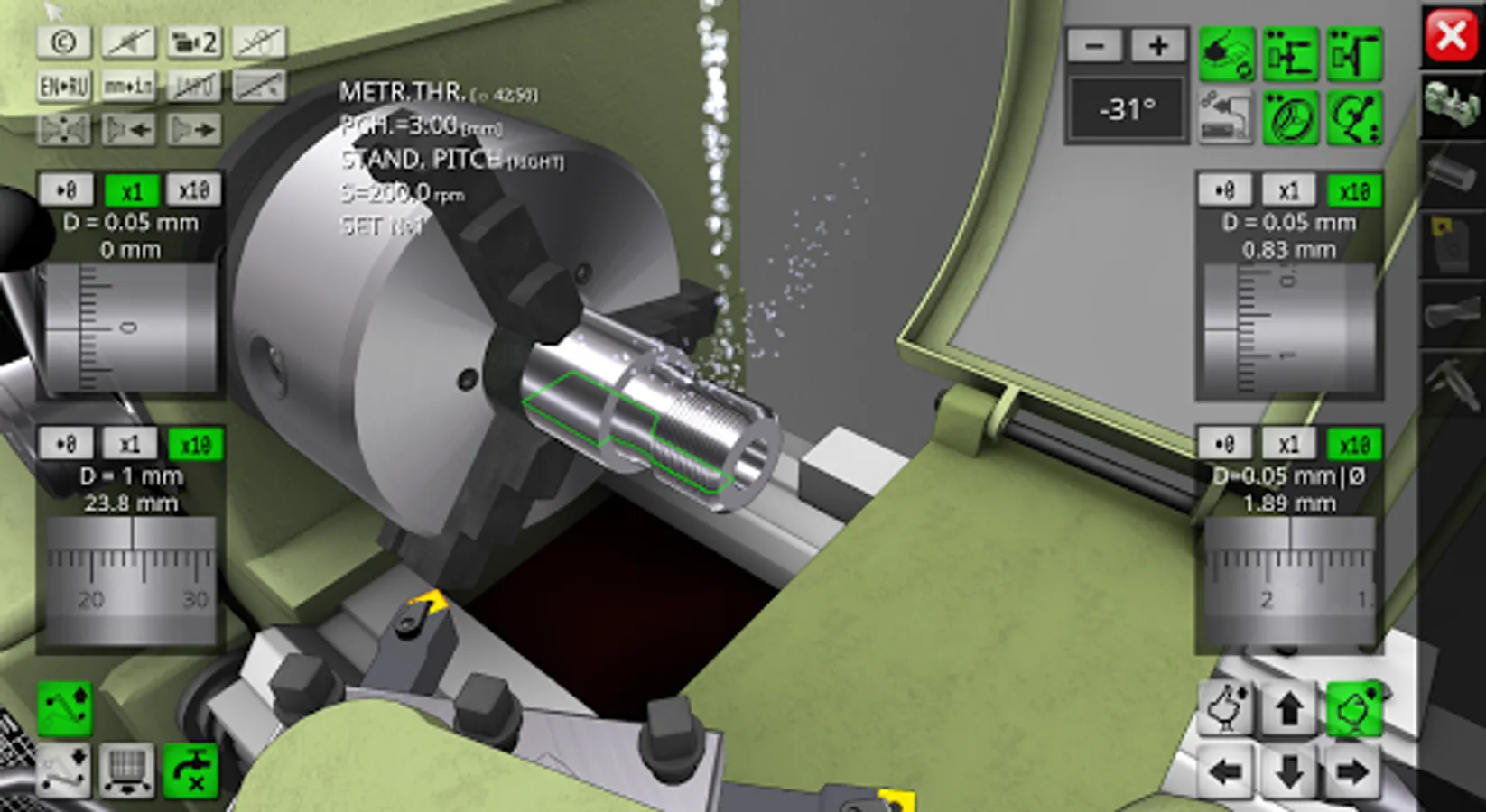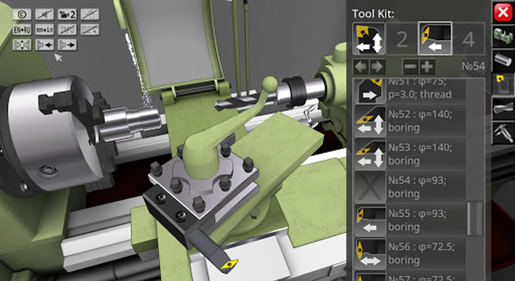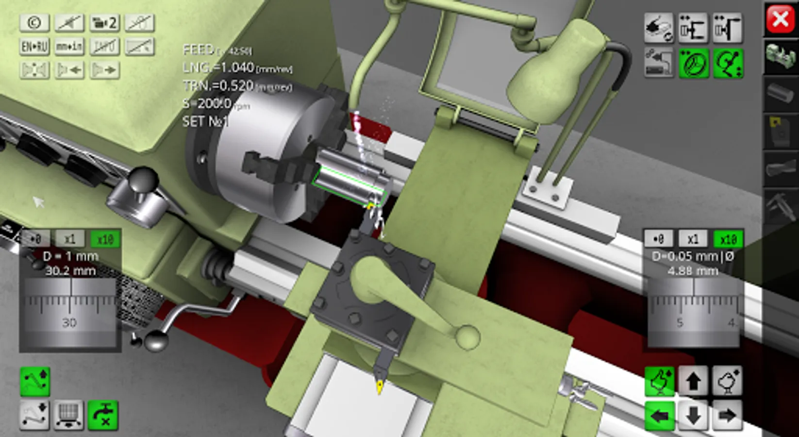 3D simulator of a classic screw-cutting lathe machine mod. 1K62. The application simulates the performance of ordinary turning operations in an interactive mode. The capabilities of the simulation model include operations of external and facing turning, drilling and boring of holes, turning of grooves, cutting of external and internal threads. In the full version of the application, more than 70 cutting tools are available for work. The graphical user interface is made in Russian and English. Metric and inch measurement systems are supported. The required amount of video memory of the device is 350 MB. The graphical system of the application uses the components of OpenGL 3.0.