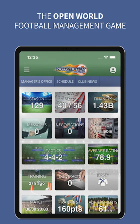 Stadium, infirmary, training center, shop, TV channel of the club. Virtuafoot Manager will ask you for all your managerial skills. The prosperity of your club will depend on it.