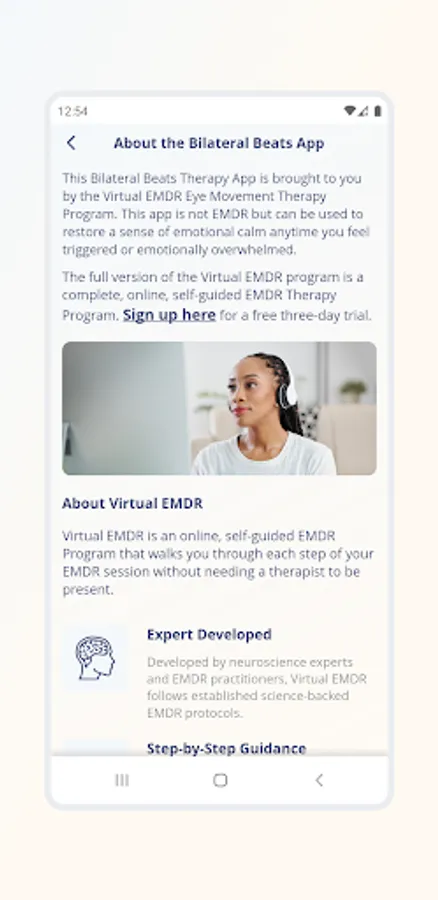 This bilateral beats EMDR app is brought to you by the Virtual EMDR Eye Movement Therapy Program. The app is not full EMDR but can be used to restore a sense of emotional calm anytime you feel triggered or emotionally overwhelmed.