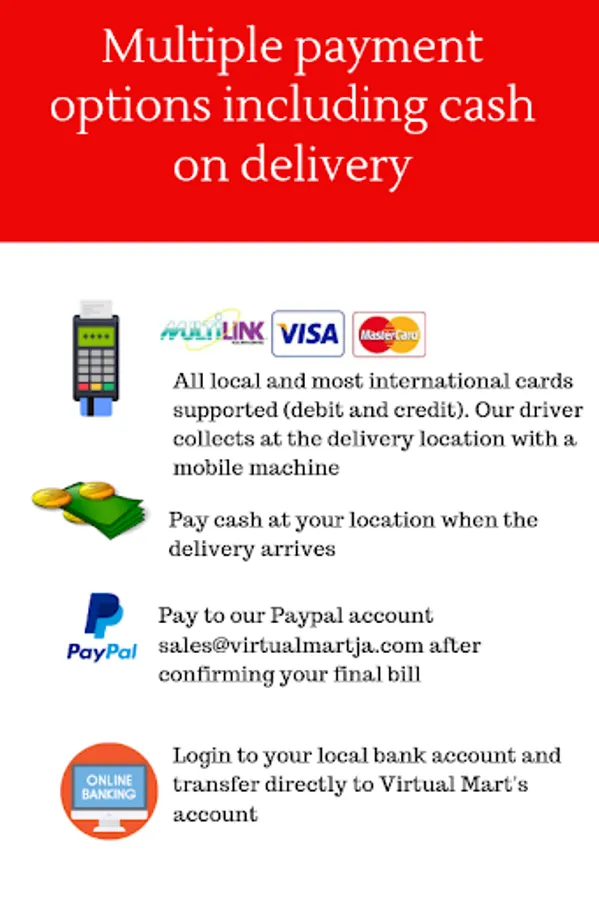 You can pay with cash/card/e-bank/paypal when your goods arrive. We deliver within 24hrs or once per week to all parishes outside of Kingston/St Andrew and St Catherine. Order before 10 a.m. for any day same day delivery for Kingston/St Andrew and St Catherine