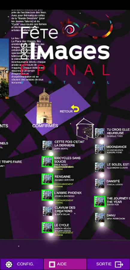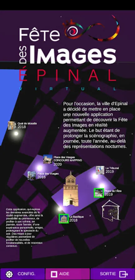For the occasion, the city of Epinal has decided to set up a new application to discover the Festival of Images in augmented reality. The goal is to extend the scenography, during the day, all year round, beyond the nocturnal performances. By downloading the application, you will have the possibility to aim from the Quays of the Moselle the architecture of the rue du Colonel Sérot as well as the north facades of Place des Vosges, or the belfry of the Basilica of Saint Maurice, the Place de the Hearth, the Tribunal, and to bring out extracts from old shows, perfectly calibrated and modeled on the image displayed in real time on its screen. This application, which explores the latest advances in augmented reality, thus offers walkers the possibility of enjoying at their own pace, during the day, all year round, a personal, unique experience, extending the evening show. Regular updates allow you to take advantage of new features and new content.