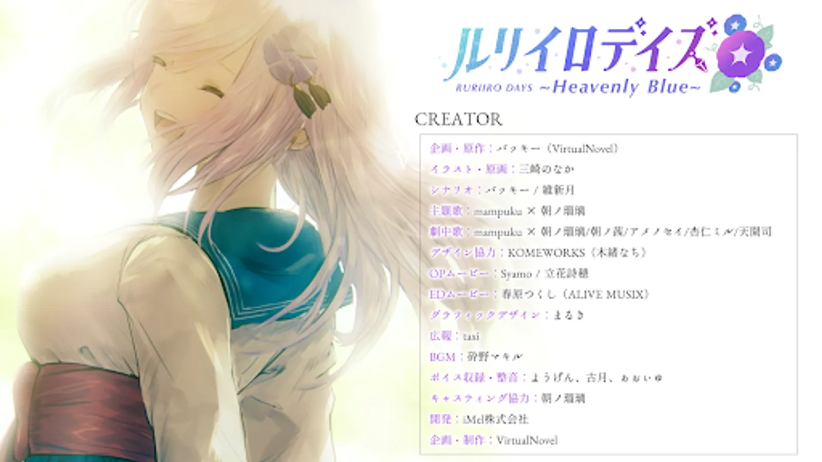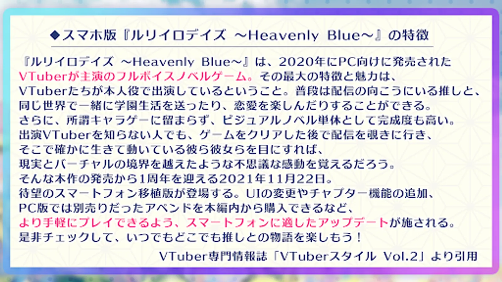 "Ruriiro Days ~ Heavenly Blue ~" is a full-voice novel game starring VTuber released for Windows PC in 2020. The biggest feature and charm is that VTubers are appearing in their own roles. You can live a school life together in the same world and enjoy romance with the push that is usually beyond the distribution. Furthermore, it is not limited to so-called charage, but it is also highly complete as a single visual novel. Even if you don't know the appearance VTuber, if you go to the distribution after clearing the game and see them who are certainly alive and moving there, you will be impressed as if you crossed the boundary between reality and virtual. You will remember. On November 22, 2021, which marks the first anniversary of the release of this work, the long-awaited smartphone ported version will appear. Updates suitable for smartphones will be made so that you can play more easily, such as changing the UI, adding chapter functions, and purchasing the append that was sold separately in the PC version from within the main part. Check it out and enjoy the story of pushing anytime, anywhere!