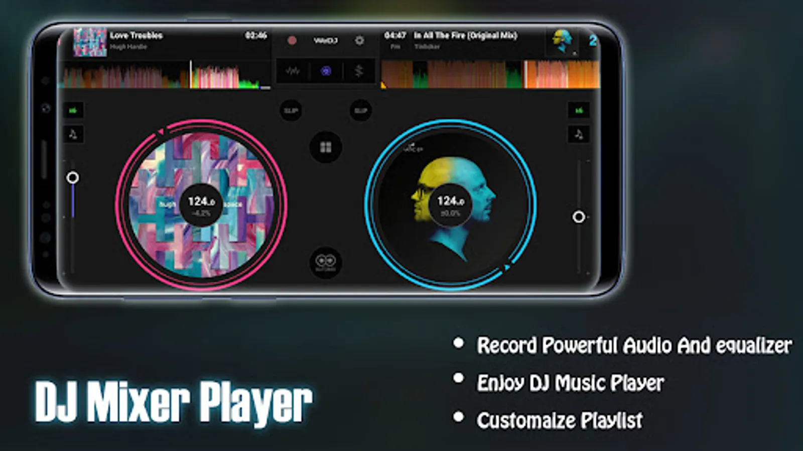 Virtual Dj Mixer app and mix songs for your dance party. Mix songs from your phone or tablet and mix it with existing available DJ tracks.