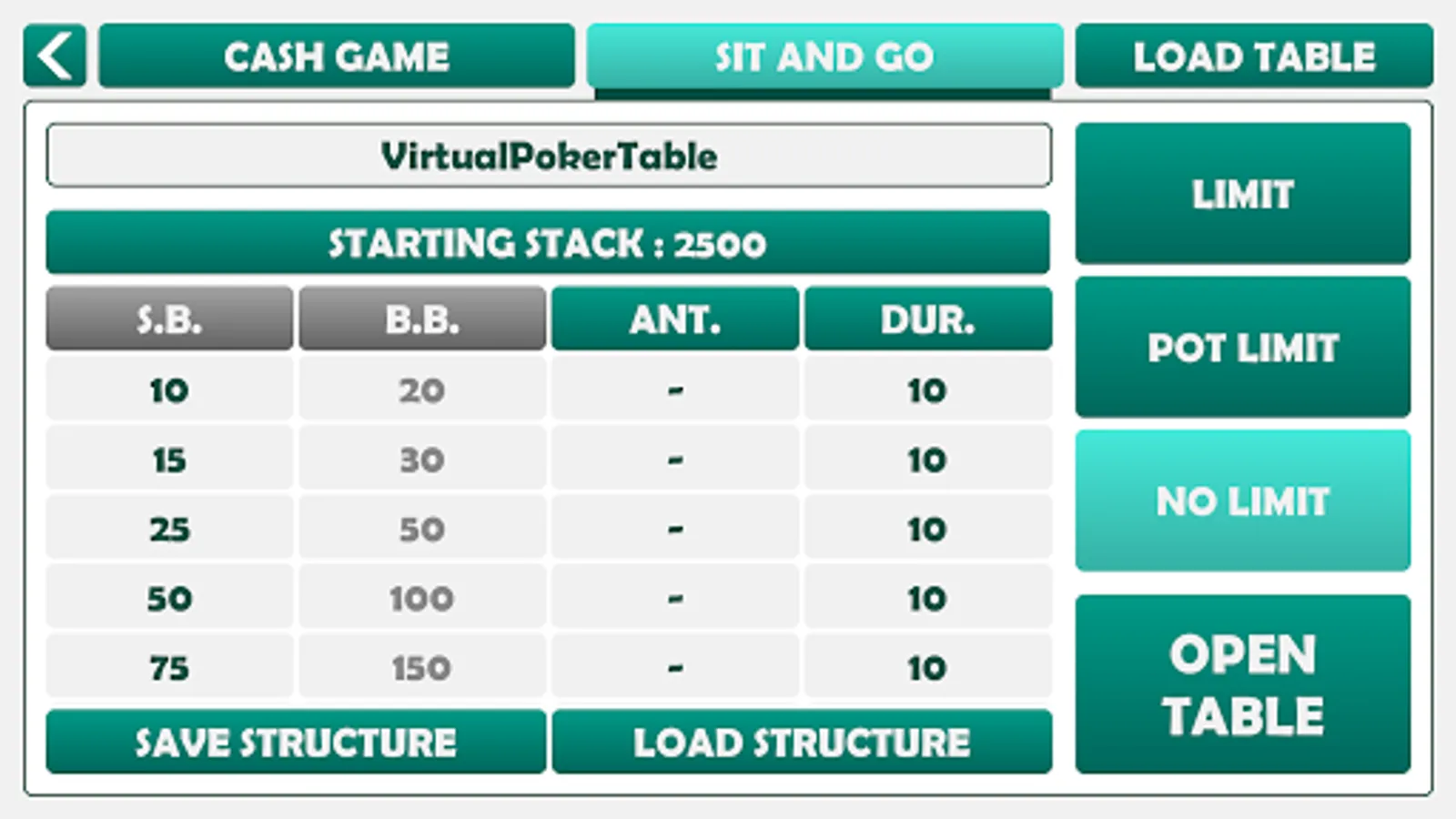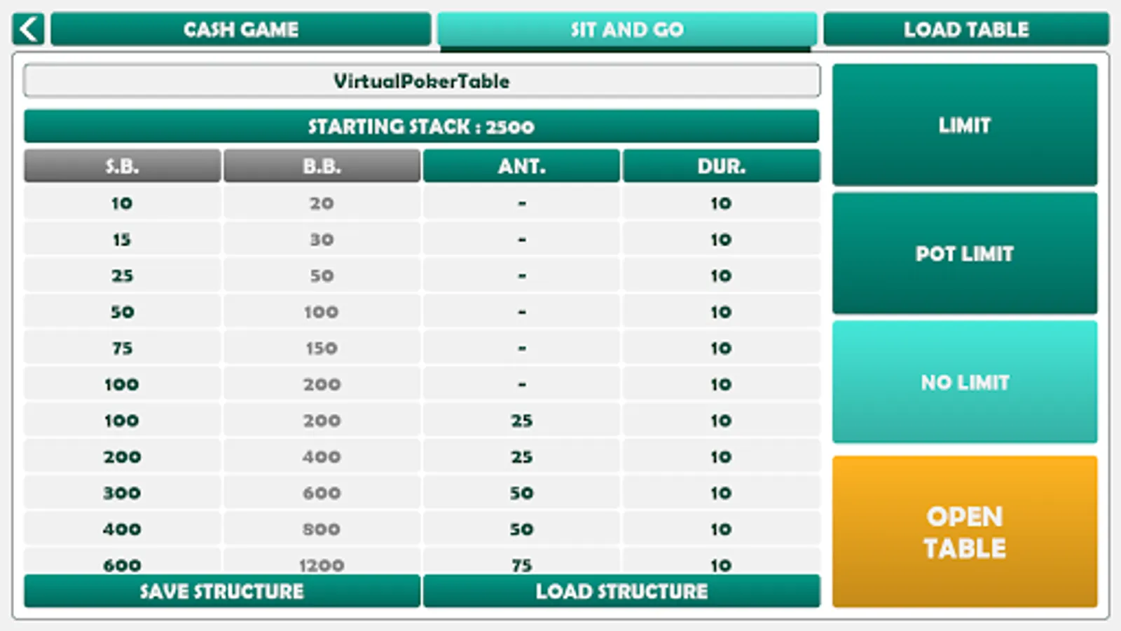 -- Sit & Go tourney : select your preferred structure of blinds, ante, durations and the table will manage the timers, blind level automaticaly